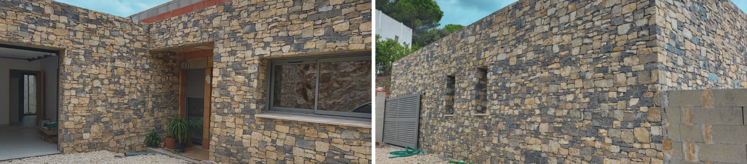 Sur ce chantier, nous avons réalisé l’habillage complet des façades d’une maison en parpaing avec une pierre naturelle bicolore. L’association des deux pierres donne à la façade un rendu vivant, avec des variations de teintes qui s’animent selon la lumière. Les encadrements de portes et fenêtres, les angles et les arêtes sont traités avec précision pour un résultat net et solide.