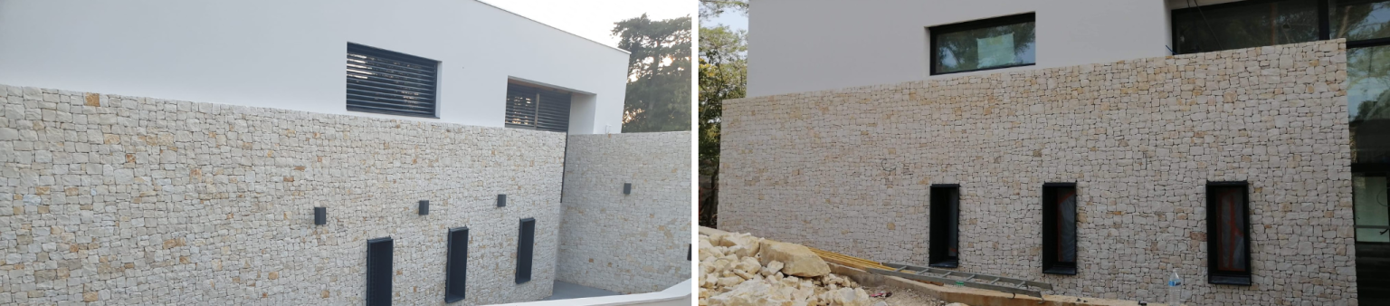 Découvrez la façade complète d’une villa contemporaine en pierre locale beige et blanc cassé. Le format régulier et la teinte homogène soulignent les lignes modernes tout en gardant le grain naturel. Les murets paysagers prolongent cet habillage pour une parfaite harmonie entre la maison et le jardin.